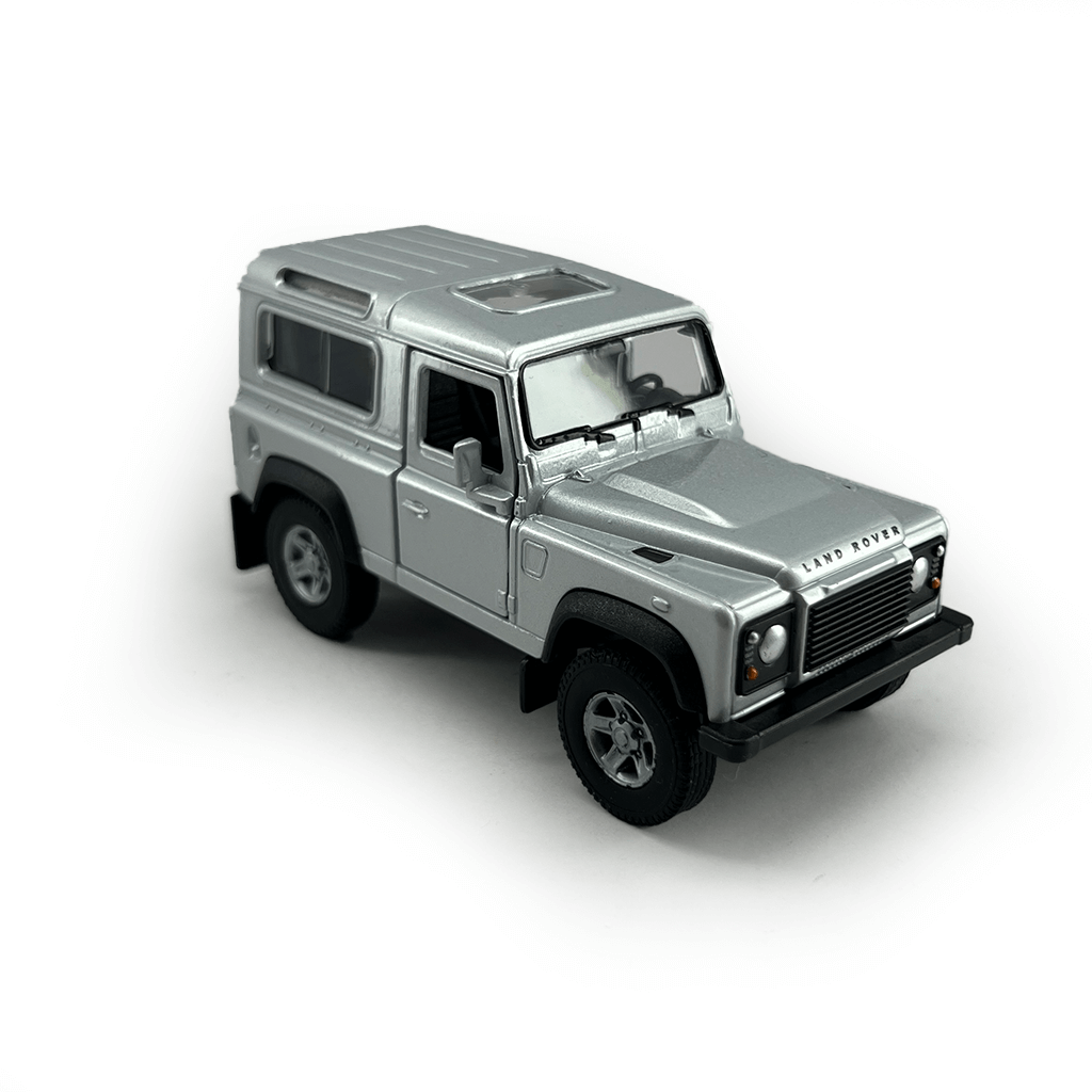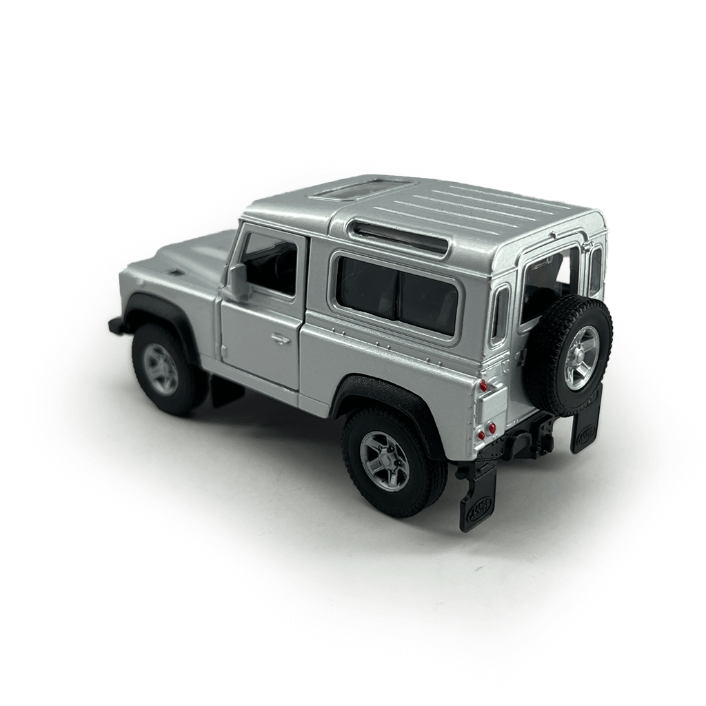 Моделот доаѓа во металик сребрена боја, со отворачливи врати и вградена pull back & go функција која овозможува реалистична игра. Деталите како roof lines, широки гуми, и цврст изглед го прават идеален избор за љубителите на класичен Land Rover стил и отпорност.